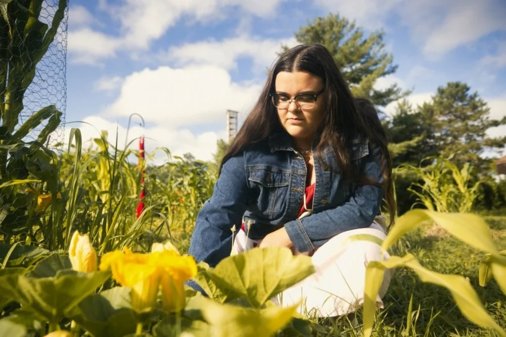 Mikayla Thompson working in the 3 Sisters Garden at the Nokomis Cultural Heritage Center in Okemos, Michigan.